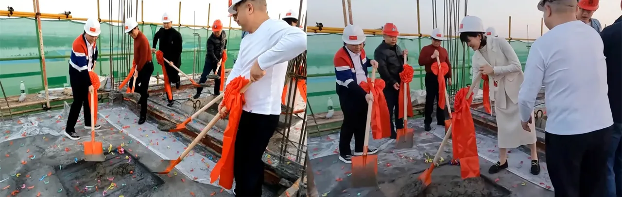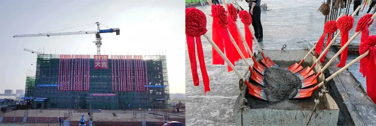 从一块平地到首栋大楼喜封金顶,每一个角落都凝结着匠人们的心血与汗水,从雄伟宏大的项目蓝图构想,到如今首栋主体建筑建成,红布金字的“封顶大吉”字样,在阳光中熠熠生辉,格外瞩目。